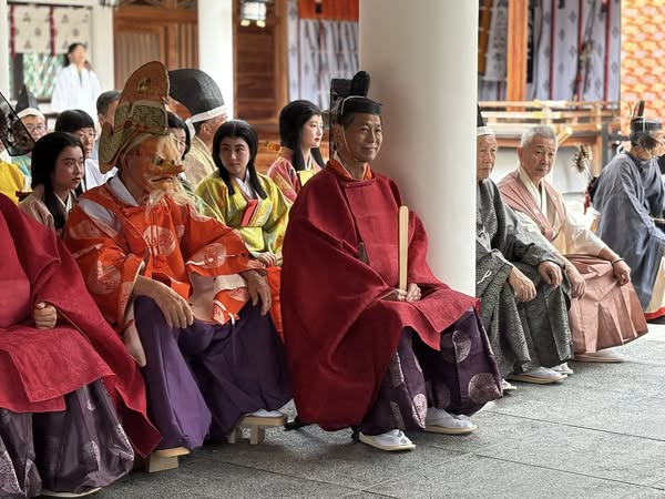 本殿にて神事の後、舞楽「還城楽(げんじょうらく)」と「五節舞(ごせちのまい)」が奉納されました。 日常の喧騒を離れて、名月を愛で、伝統芸能を堪能させていただきました。